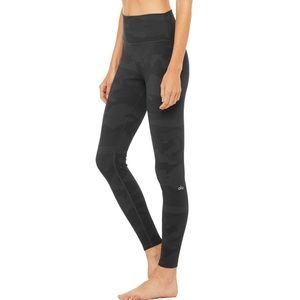 ALO Vapor High Waist Leggings, NWOT, Size Medium, Color/Print- Black, Gray/Camo. Signature lifting fabric with moisture-wicking technology adds everyday comfort to high-waist leggings that are perfect for studio and around-town wear alike. 29” inseam, 8” leg opening, 11 1/2” rise, moisture-wicking antimicrobial technology, four-way-stretch fabric, 73% nylon, 27% Lycra spandex.