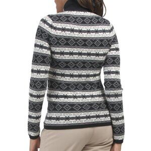 patterned design, text accent, ribbed collar, cuffs and hem