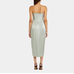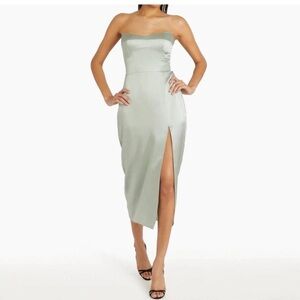 A strapless dress so versatile you can dress it up with heels or wedges, or give off a more casual vibe with flats. Introducing the Ivy Dress by Amanda Uprichard, a strapless sheath style in sophisticated Sea Salt. This 43-inch midi dress made from 100% silk features a soft V-neck and an invisible zip closure for a streamlined silhouette. It showcases pointed detailing at the bodice and a daring slit, enhanced by boning at the side seams for structure and smocking at the back for comfortable stretch. Care for this exquisite piece with dry cleaning only, and enjoy its chic allure for any special occasion.