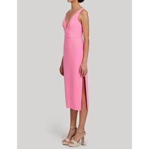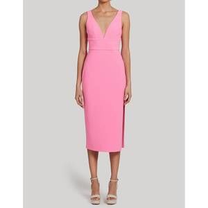 Midi Dress. Unlined. V-Neck, Wide Straps, Side Front Slit. Invisible Back Zipper with Hook and Eye. Dry Clean Only. Model is 5'10”. HPS: 47”