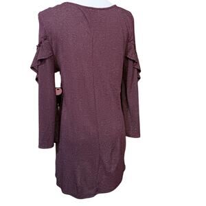 This blouse features a beautiful dark purple color with subtle sparkle accents, perfect for dressy occasions or adding a touch of elegance to your career wear. The flattering tunic style and ruffle detailing create a chic and sophisticated look.