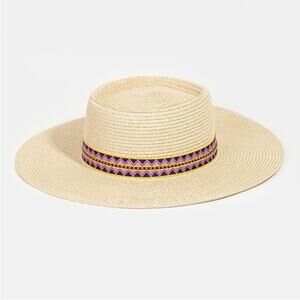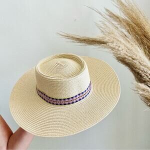 NEW ANTHROPOLOGIE Cream Tan Straw Wide Brim Floppy Purple Print Ribbon Sun Hat