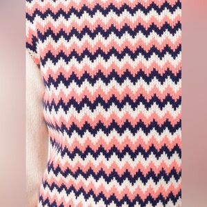 Stay cozy and stylish with this chevron patterned sweater. Featuring a blend of pink, blue, and cream colors, this sweater is perfect for any casual outing. Enjoy the comfort and warmth it provides.
