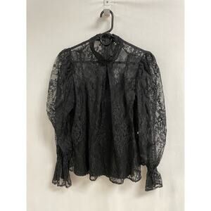 NEW AQUA Puff Sleeve Lace Blouse High Neck Pleated Sheer in Black Women's M