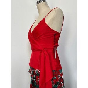 Lovely bright red satin georgette. Dress up or down. 100% polyester. Bodice lined with 100% polyester chiffon. Approximate measurements are 14.5” flat from pit to pit. Waist is 13.” Peplum is 6” and center back, with invisible zipper and hook & eye closure is a little more than 10.” New, with tags.