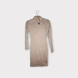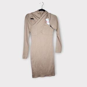 Tan long sleeve bodycon dress with a front cutout and wrapped neckline. Stretchy ribbed knit material with neck closure.
