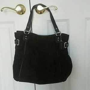 Never used! Deep chocolate brown. Leather handles, suede body, silver accents. Kept in and comes with dust bag.