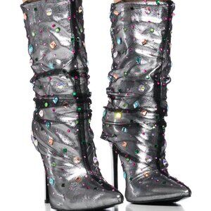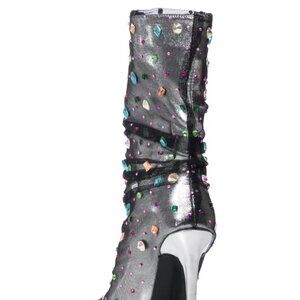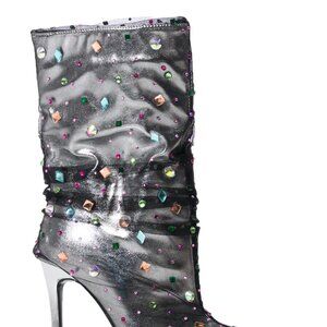 Live your popstar fantasy irl in The AZALEA WANG Liora Silver Gem Bootie. These metallic booties feature a faux leather fabrication, a ruched tulle overlay, a pointed toe silhouette, a mid-calf height shaft, a pull-on fit, and a stiletto heel. Complete with multicolor gemstone accents throughout.