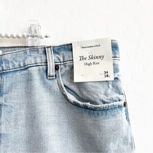 New with tags - Abercrombie & Fitch 'The Skinny High Rise' jeans. One busted knee, light wash. Retail $99.