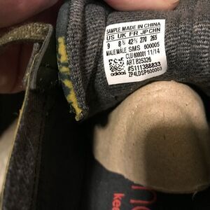 Adidas RocketBoost Olive ClimaHeat Mens 9 42 2/3. These are marked sample which means they are pre-production models which may or may not have made it to market in this configuration. The uppers are a olive color as well as the laces. The heel has a camo type of pattern. The boost runs throughout the full sole and the bottom tread is a trail type pattern not smooth. These are well suited for either road running or trail running.