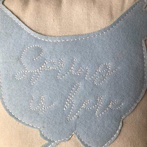 Cream front with light blue felt chicken with "Spring is here" embroidered on it in script