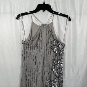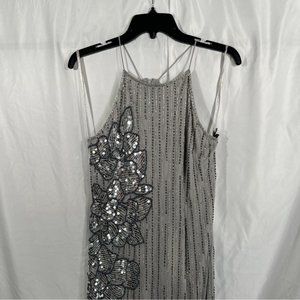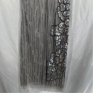 Bridal silver, sleeveless cocktail dress by Adrianna Papell boasting a tulle overlay,