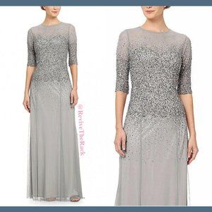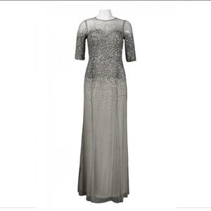 NEW Adrianna Papell Beaded Illusion Bodice Mesh Gown in Grey‎ [Petite SZ 4P ]