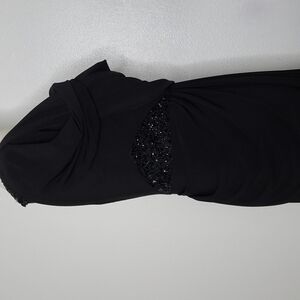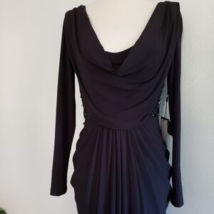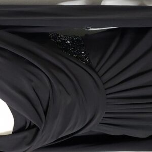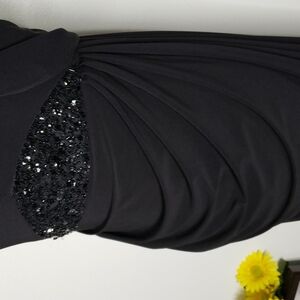 Adrianna Papell Black Sequins adorn Black Maxi Dress Long Jersey Knit Formal Dress with a Cowl Neckline, Long Sleeves and Black Sequin Side Insets at waistline.