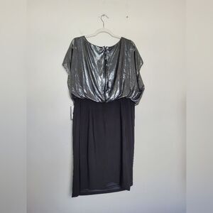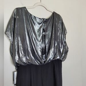 New with tags $149 dress by Adrianna Papell. Stunning sparkly silver metallic surplice bodice and a fitted slimming black skirt. Flattering and perfect for any formal occasion. Tagged size 16W measures approximately 40 inches long 23 inches underarm to underarm laid flat 38 inch waist.