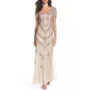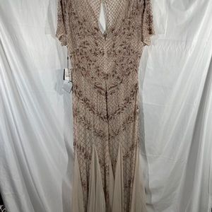 NEW Adrianna Papell Floral Beaded‎ Mesh Mermaid Gown in Biscotti [SZ 8 ]