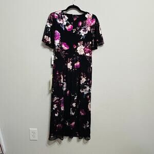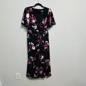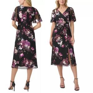 NEW Adrianna Papell Foil Floral Stretch Mesh Flutter Sleeve Front Slit Midi Dress 6 Small