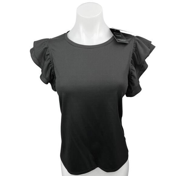 NEW Adrianna Papell Kaia Black Flutter Sleeve Ribbed Knit Crop Tee Blouse Top S