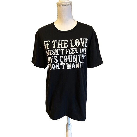 Gildan brand adult size medium 100% cotton T-Shirt. Color is black and it says on the front "If The Love Doesn't Feel Like 90's Country I Don't Want It". Stored in a smoke-free environment.