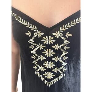 • Beautiful Cream, Tan And Gold Embroidery Detail On Front. With Ruffled Spaghetti Straps And Criss-Cross Tie Back. Shorts, Romper, Jumper Style