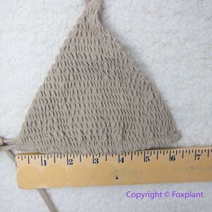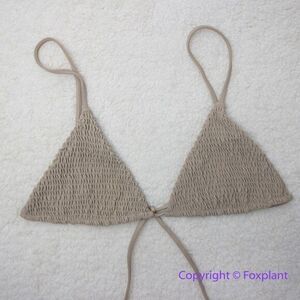 So essential and forever-timeless, this made for everyday bikini top is featured in a classic triangle-style and smocked fabrication with thin fixed shoulder straps, chunky resin rings, and an adjustable tie-back. Fixed straps Self-tying back Minimal coverage Specifically, this product was made with Eco-Conscious Design: It contains at least 50% of a certified eco-conscious fiber or process.