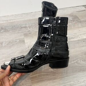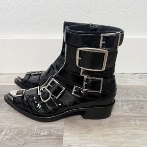 Punk buckle-detail ankle boots from Alexander McQueen featuring black, patent leather, polished finish, silver-tone hardware, branded insole, decorative buckle detailing, engraved logo, metal toecap, pointed toe, side zip fastening, low block heel and ankle-length.