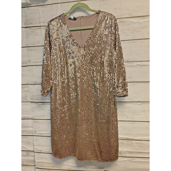 NEW Alfani Womens Allover Sequined Dress Lined Beige Size 12 3/4 Sleeve Back Zip