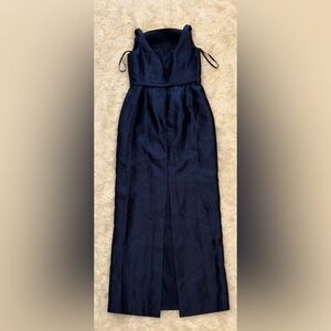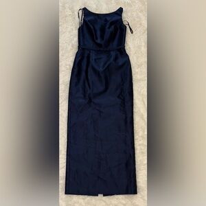 NEW Alfred Sung Strapless Bow Belt Satin Twill Column midnight blue Gown Sz 10