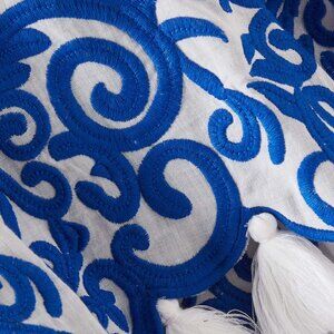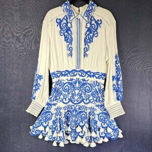 Brand new without tag Size 12 Colour: White, Blue Bust: 21.5" Waist:16" across Hip:20" across Sleeves:25" Length from shoulder:36" Alice + Olivia’s romantic yet sophisticated sense of style is captured in this cotton mini dress. It's covered in tapestries of vibrant embroidery with intricate cut-out detailing. It features a shirt collar, balloon sleeves, and a tiered skirt hem with tassels. Fitted to perfection around the waist, this is a flattering silhouette you can dress up or down. Front button closure Concealed back zip fastening Balloon sleeves Smocked cuffs and back waist Layered scallop-edge hem with tassels Ladder lace trim 100% cotton, Lining: 100% polyester, Dry clean Made in India