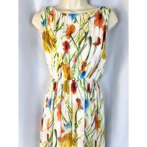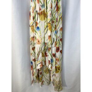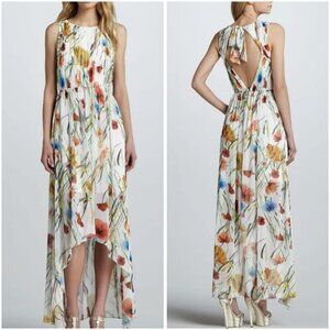 Alice + Olivia Mel floral sleeveless maxi dress. Hi-lo hem silhouette for an updated finish. Flowy floral-print chiffon. High scoop neckline; pleated bodice; open back ties at neck. Elastic waistband with back zipper closure. Lined mini skirt.