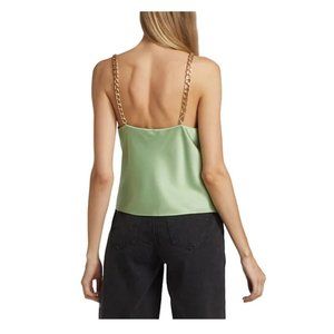This tank top is made of draped satin with golden chainlink shoulder straps.