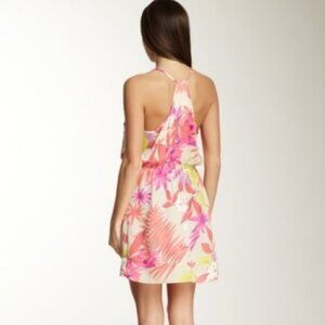 Alice & Trixie 100% silk tropical print racerback sundress. Dress has an elasticized waist, front pockets and a split neck. Dress is unlined.