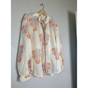 Alix of Bohemia Poet Cotton Floral Ruffle Collar Blouse Papaya Aster. New without tag! Size: Small Fabric: 100% Cotton Relaxed Floral motif shirt has a ruffled collar and cuffs, a mother-of-pearl button front, and dramatically gathered sleeves. Crafted from a lightweight cotton voile, the vintage-inspired shirt has a border-print button placket and a semi-sheer texture in the swaths of white. blouse, top, cotton, button, ruffle, floral, bohemian, casual, modern, classic, chic, spring, summer, winter, fall Alix of Bohemia Poet Cotton Floral Ruffle Collar Blouse Papaya Aster