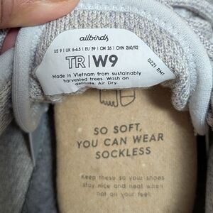 New women's Allbirds Tree Runner. Size: Women's 9. Color: Silver or Light Gray. No rips, tears or stains. Will come from a pet and smoke free home. Shoes will be mailed in an Allbirds box (not box of actual shoes). Thanks for checking out my closet!
