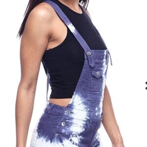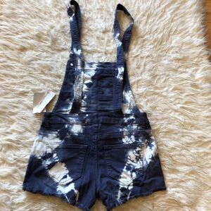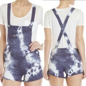 NEW Almost Famous Denim Short Overalls Tye Die Blue White Raw Hem Size 5 Summer