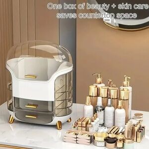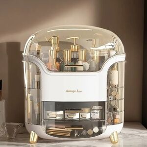 NEW! Amazing Storage Pod for All Your Cosmetics and Skin Care Creams! This really has a lot of space! It holds so much! Please see all pictures as they are part of the description and contain product information like the measurements. The last picture shows the only flaw. It says Storagw Box on the front and it’s crooked. The doors don’t latch which makes them easy to open with only one hand! I only have one of these and I’m not sure I can get any more.