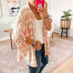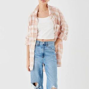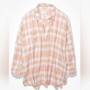 American Eagle Linen Blend Plaid Oversized Beach Shirt