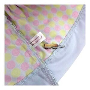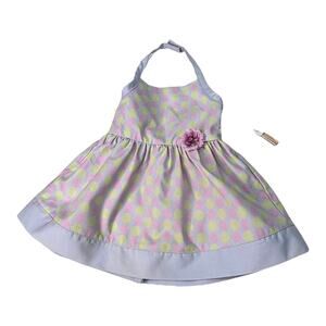 • Dress: Pastel dot dress with cornflower trim and halter neckline. Faux flower rosette on left side of waistline.