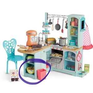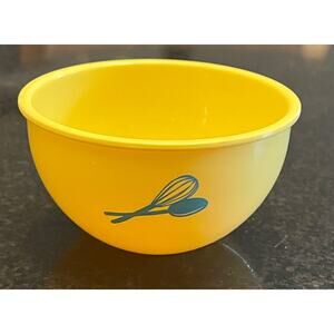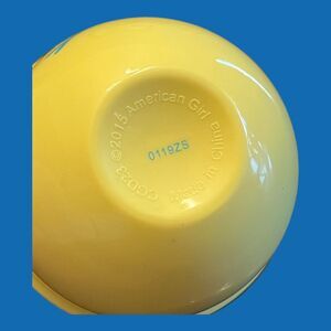 • A yellow mixing bowl from the American Girl Gourmet Kitchen accessory set. Designed for use with 18-inch dolls, the bowl features a printed image of a whisk and spoon on the exterior. It’s part of a themed collection of doll-sized kitchen accessories that encourage imaginative play by allowing children to simulate cooking and baking activities with their American Girl dolls.