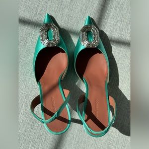 Amina Muaddi women’s Camelia Crystal Buckle Slingback Pump. New in box. Size 9.5/39.5. SATIN CARIBBEAN. Retails for $1268.