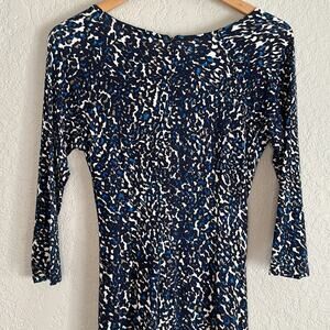 NEW Ann Taylor Faux Wrap Dress Blue Grey Watercolor V Neck Office Artsy Stretchy
