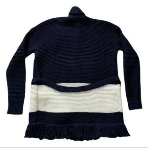 Loft navy blue and white knit open front cardigan with fringe. Tie belt closure. Wool blend. Super soft! Size small. No rips, tears, or stains. There are a few minor pills on the sweater, but I’m going to try and remove them before shipment. Very minimal signs of wear. Feel free to ask questions.