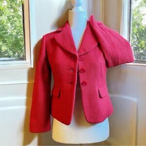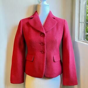 New without tags Gorgeous Vibrant Coral Pink Career Tailored Wool Chevron Knit Classic Single Lapel Blazer Jacket by Ann Taylor Loft. Three Button Close. Two Decorative Front Pockets. Long Sleeves. Lined. Warm Mid Weight Fabric. Fabric has a “Fuzzy” Lofted Texture. See photos. Coral Pink. Size 0P.