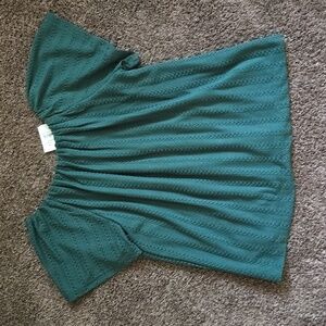 Dark Forrest green crochet eyelet top with short flutter sleeves. Elastic scoop neckline. Completely lined body!