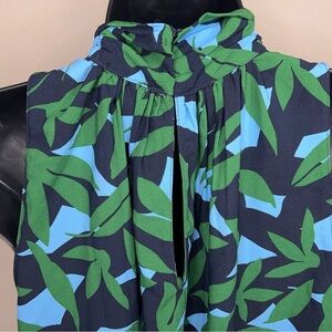 NEW Ann Taylor Petite Medium Blouse Green Blue Leaf Print Tie Neckline High Neck