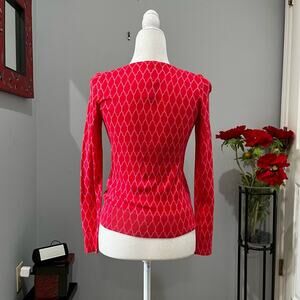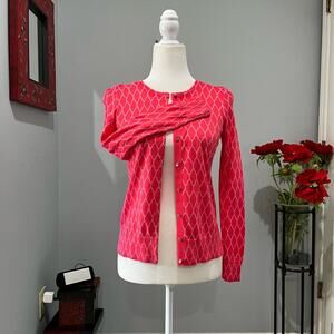 New with tags Gorgeous Pink Coral Quatrefoil Geometric Crew Neck Button Front Prep School Style Cardigan Sweater by Ann Taylor. Long Sleeve. Lightly Ribbed Cuffs and Hem. Lightweight Cotton Rayon Knit. Women’s Size XSP.
