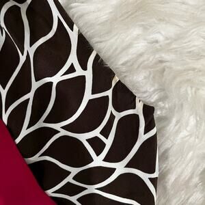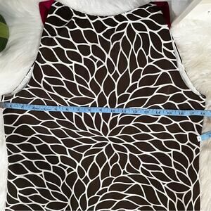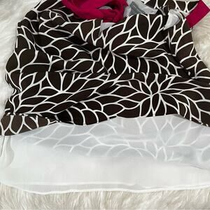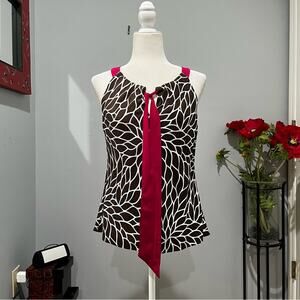 New without tags Beautiful Tiered Silk Classic Contrast Dark Brown and White Spiral Flower Patterned Tri-Color Sleeveless Top with Keyhole Neck and Bright Fuchsia Pink Self Tie Front Bow Closure. Pull on Styling. Women’s Size 4. Lined.