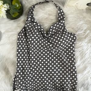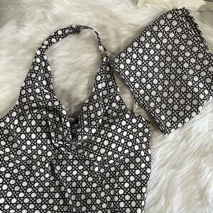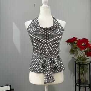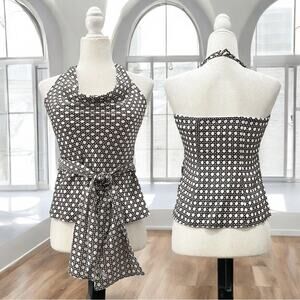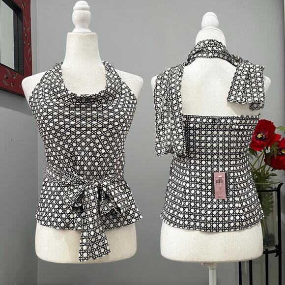 New with tags Beautifully Flattering 100% Silk Tailored Classic Contrast Two-Tone Fitted Halter Multi-Way Blouse and Scarf Wrap Belt by Ann Taylor. Sewn in Padded Bra Cups. Pull on Styling. Side Zipper Closure. Flounced Hem. Low Cowl Neck with Double Button Halter Closure at Nape. Amazing Exposed Shoulder Fitted and Darted Back with Elastic. Ivory and Brown Cross Hatched Patterned Print. Women’s Size 2P top and One Size Belt/Scarf.