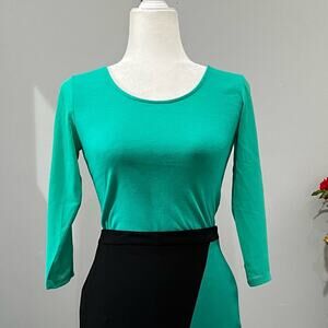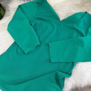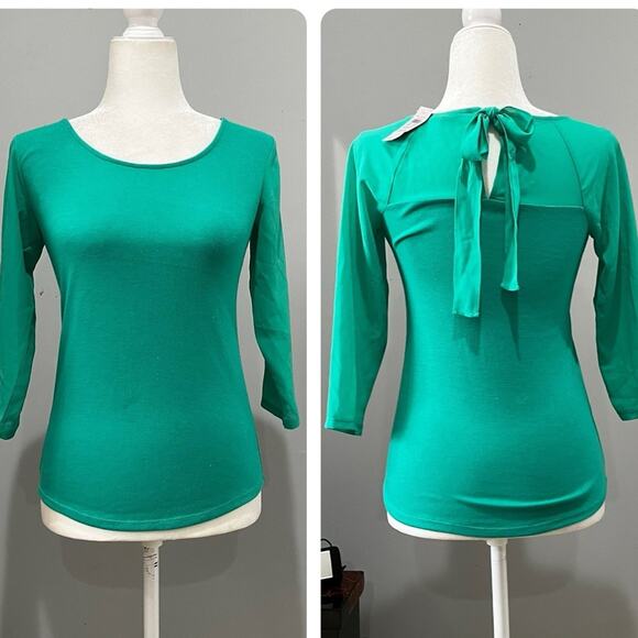 New Stunning Vivid Mint Green Tricot Knit and Semi Sheer Rayon Chiffon Exaggerated Bow Tie Neck Layering Sweater Top. Semi Sheer 3/4 Sleeves. Scoop Neck. Classic Fit. Size XXSP.