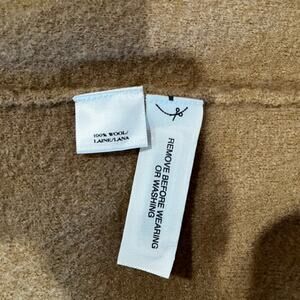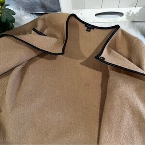 New without tags 100% Wool Contrast Two-Toned Swing Asymmetrical Collarless Sweater Blazer Jacket by Ann Taylor. Faux Leather Piping. Longline Styling. Long Sleeves. Double Snap Closures at Neck. Blanket Weight. Size Women’s XSP. Slightly Oversized. (See measurements). Camel/Tan and Black.